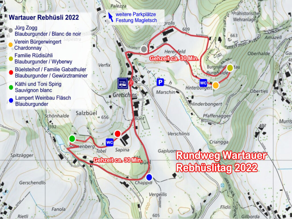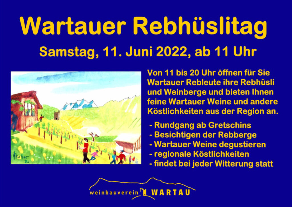 Der Weinbauverein Wartau lädt die Bevölkerung zu einer Wanderung durch die Rebberge und zum Verweilen bei sechs Rebhüsli ein. Gerne geben die Winzer Auskunft über die fachgerechte Pflege der Reben und was es braucht, damit schlussendlich ein feiner Wein daraus entsteht. Selbstverständlich kann man die Wartauer Weine degustieren und sich bei einem kleinen Imbiss stärken.